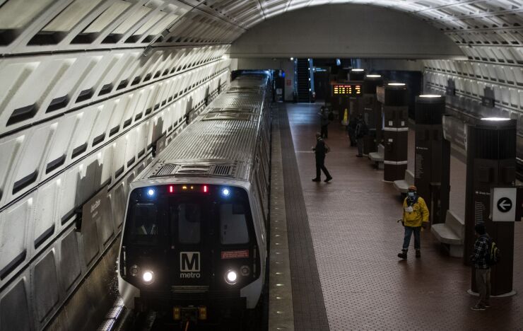 "Ridership on both Metrorail and Metrobus is growing, but remain below pre-pandemic levels," a WMATA spokesperson told The Bond Buyer. "Metrobus ridership retention has been stronger than Metrorail throughout the pandemic. It is currently about 75% of pre-pandemic on weekdays, and near pre-pandemic on weekends. Metrorail ridership has been more heavily impacted."