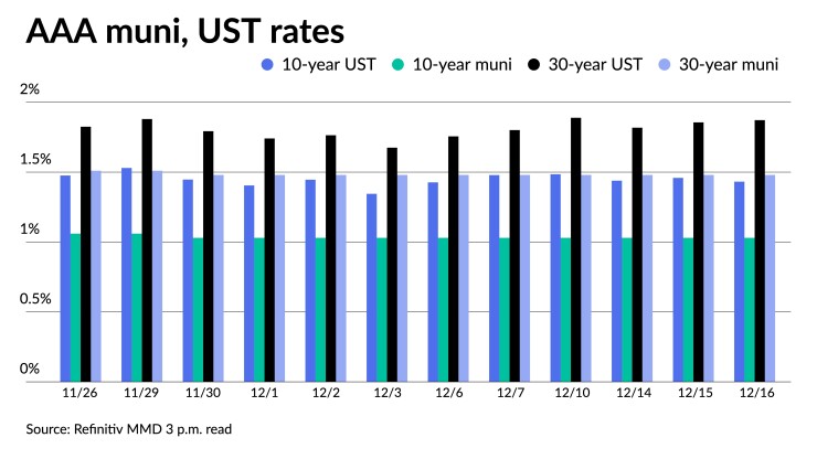 The IHS Markit municipal analytics curve was steady: 0.17% in 2022 and at 0.26% in 2023. The 10-year was at 1.02% and the 30-year at 1.49% as of a 3 p.m. read.