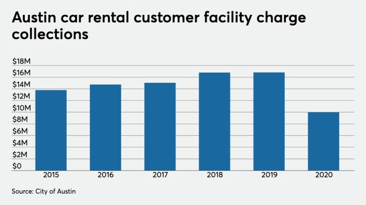 Austin’s customer facilities charges, levied per day on car rentals, rose this year to $8.50 per day from $5.95 in 2020. City officials are aiming to lower that CFC through this bond transaction.