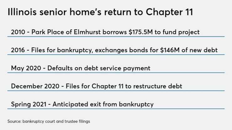 The Park Place of Elmhurst, in the western Chicago suburb of Elmhurst, filed for Chapter 11 bankruptcy in December after reaching agreement with holders of a majority of principal from the $141 million remaining due from $146 million of bonds issued in 2016 through the Illinois Finance Authority. Those bonds were issued to exit the previous bankruptcy in exchange for the remaining principal from the initial $175.5 million unrated 2010 issue.