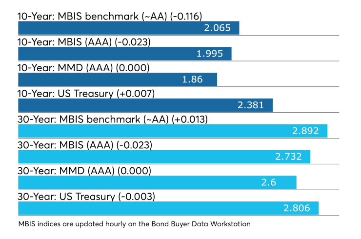 Data appearing in this article from Municipal Bond Information Services, including the MBIS municipal bond index, is available on The Bond Buyer Data Workstation.