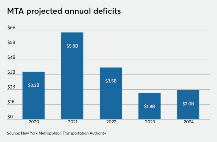 Even with further COVID-19 rescue aid, which the U.S. Senate is debating and is hardly a given, the nation’s largest mass-transit agency is staring at massive red ink, including a projected $16 billion deficit through 2024, and a vast range of immediate uncertainties that could include more rating downgrades.