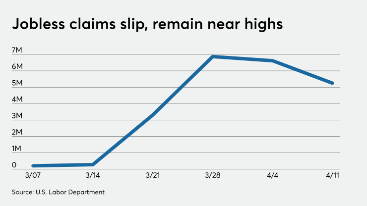 Meanwhile, initial jobless claims fell 1.37 million to 5.245 million in the week ended April 11, the Labor Department reported Thursday. The previous week's level was revised to 6.615 million from 6.606 million, reaching 22 million in total since March 21.
