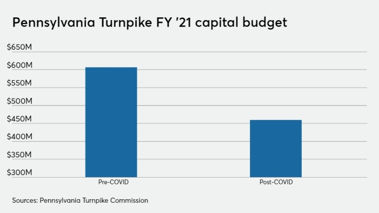 In Pennsylvania, the turnpike commission slashed its 10-year, $5.95 billion capital spending by 25% to focus on core functions. As a result, Compton said the commission pared its FY21 capital budget to $459.7 billion from $606.7 billion.