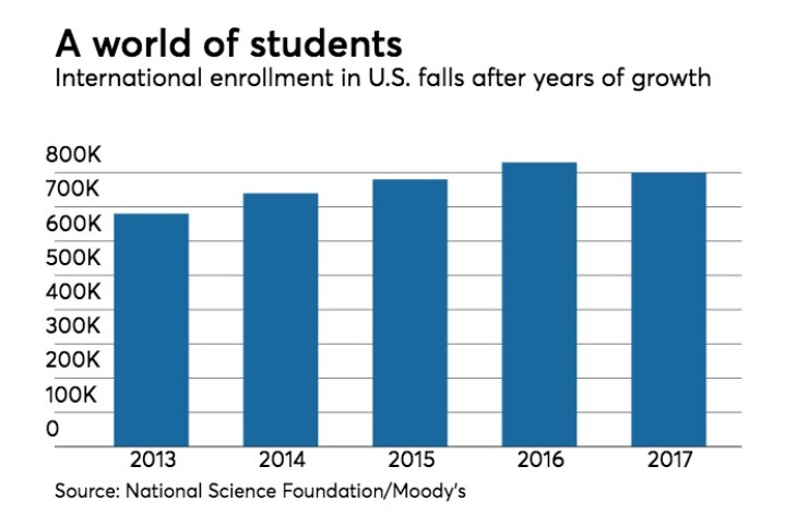 “We expect that weaker enrollment will lead to a continued rise in international student tuition discounting, which will constrain net tuition revenue,” Moody’s analyst Benjamin Howard-Cooper wrote. “Universities with more diversified enrollment across countries are less vulnerable to declines in demand from any single country.”