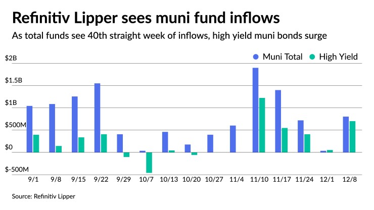 For 40 straight weeks, investors have put cash into municipal bond mutual funds, as buyers continue to show confidence in the market. Refinitiv Lipper said inflows into municipal bond funds totaled $804 million in the latest reporting period while high-yield funds were a substantial amount of that total, adding $702 million of new investment.
