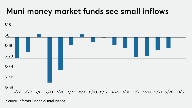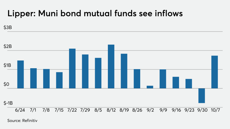 In the week ended Oct. 7, weekly reporting tax-exempt mutual funds saw $1.729 billion of inflows. It followed a loss of $774.747 million in the previous week, the first decline in 20 weeks.