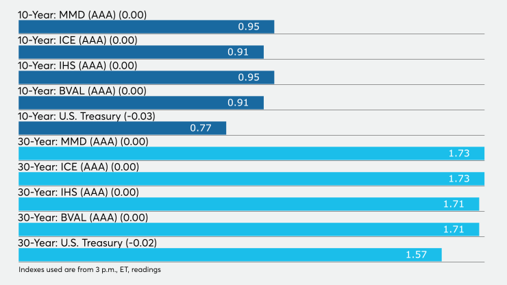 The BVAL AAA curve showed the yield on the 2021 maturity unchanged at 0.11%, the 2022 maturity unchanged at 0.13%, the 10-year flat at 0.91% and the 30-year steady at 1.71%.