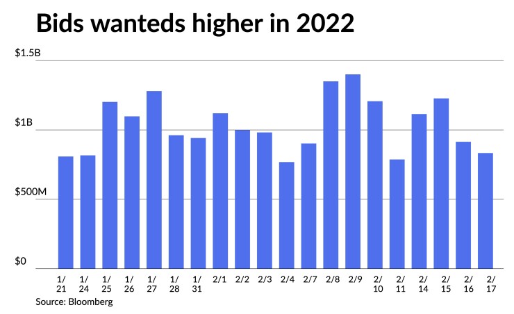 Relative value has improved though. The municipal to UST ratio five-year was at 77%, 85% in 10 and 90% in 30, according to Refinitiv MMD's 3 p.m. read. ICE Data Services had the five at 74%, the 10 at 87% and the 30 at 92% at a 3 p.m. read.