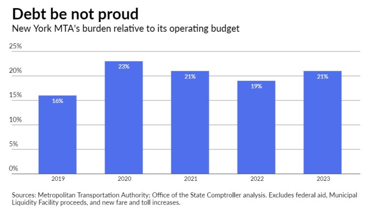 MTA debt, according to DiNapoli, will continue to exceed 20% of operating revenues. While the share of total revenue needed to fund debt service averaged 16.1% from 2010 through 2019, it rose to 23% in 2020 — excluding federal aid, Federal Reserve Municipal Liquidity Facility proceeds, and new fare and toll increases — and could flirt with 20% in the out years.