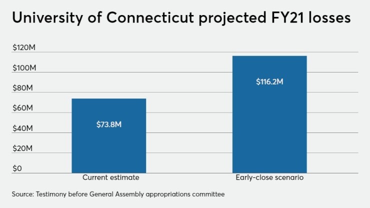 Early campus closures due to any spike in COVID-19 cases during the school year could raise the University of Connecticut's fiscal 2021 operating deficits to $116 million or higher from the current $74 million, the school president told state lawmakers.