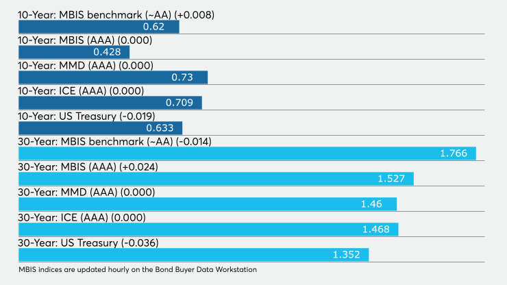 The IHS Markit municipal analytics AAA curve showed the 2021 maturity yielding 0.14% and the 2022 maturity at 0.15% while the 10-year muni was at 0.75% and the 30-year stood at 1.47%.