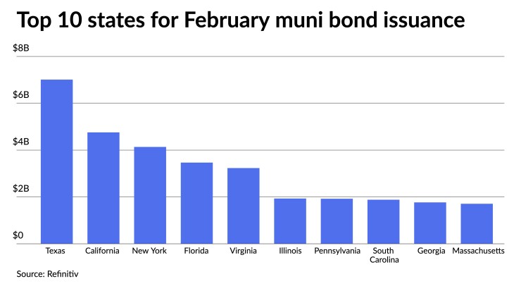 Issuance of revenue bonds decreased 28.2% to $17.239 billion from $23.996 billion in February 2021, and general obligation bond sales dropped 29.2% to $9.242 billion from $13.056 billion in 2021.