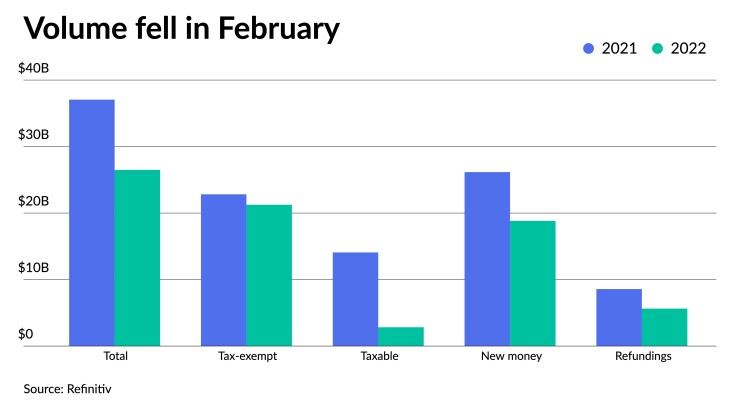 Municipal bond issuance fell 28.5% year-over-year in February led in part by a massive drop in taxable and refunding volumes amid extreme market volatility and a rising-rate environment.