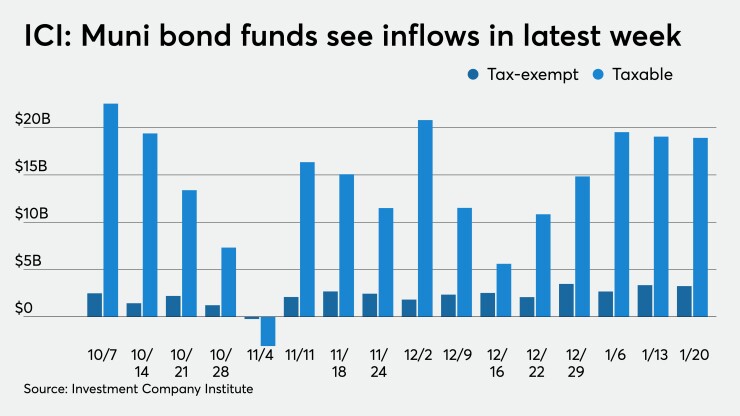 Long-term municipal bond funds and exchange-traded funds saw combined inflows of $3.835 billion in the week ended Jan. 20, the Investment Company Institute reported Wednesday.