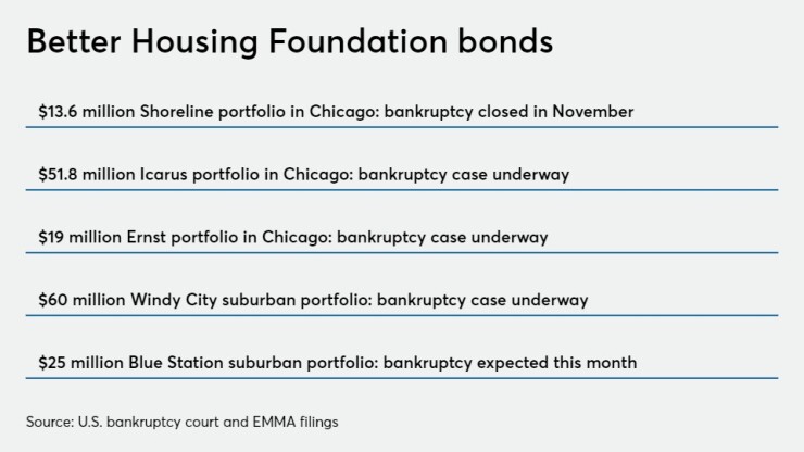 A troubled, bond-financed Chicago-area affordable housing portfolio will this month become the last of five Better Housing Foundation portfolios to file for bankruptcy, setting the stage for final bondholder payouts on $170 million of defaulted debt over the coming year.