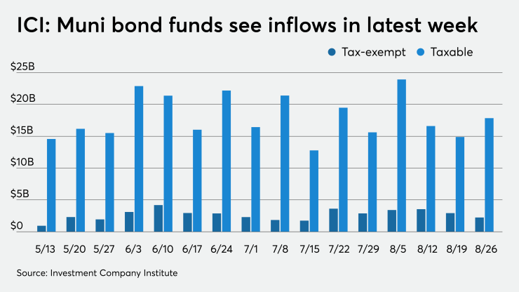 Long-term municipal bond funds and exchange-traded funds saw combined inflows of $2.238 billion in the week ended Aug. 26, the Investment Company Institute reported Wednesday.