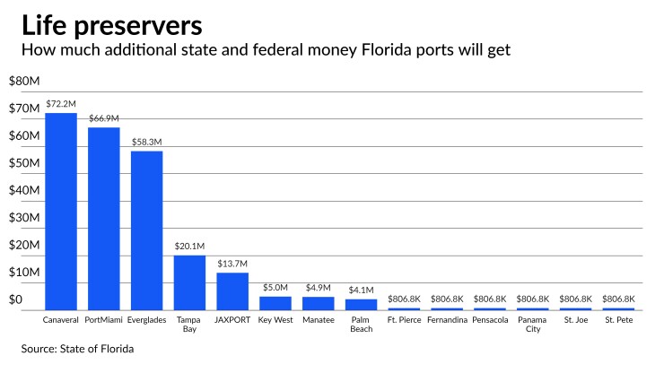 The ports getting the funding are: Port Canaveral, $72.2 million; PortMiami, $66.9 million; Port Everglades, $58.2 million; Port Tampa Bay, $20.1 million; JAXPORT, $13.7 million; Port of Key West, $5 million; Port Manatee, $4.9 million; Port of Palm Beach, $4 million; and receiving $806,772 each are Port of Fernandina, Port of Ft. Pierce, Port of Panama City, Port of Pensacola, Port of St. Joe and Port St. Pete.
