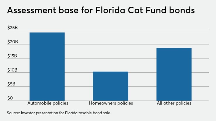 The bonds are secured by reinsurance premiums, investment income on unspent bond proceeds, and emergency assessments of up to 10% on most property and casualty insurance policies in the state. The assessment base totaled $53.2 billion in 2019.