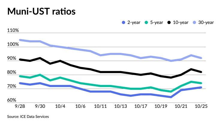 The three-year muni to UST ratio on Tuesday was at 72%, the five-year at 76%, the 10-year at 83% and the 30-year at 95%, according to Refinitiv MMD's 3 p.m. read. ICE Data Services had the three at 71%, the five at 74%, the 10 at 82% and the 30 at 92% at a 4 p.m. read.