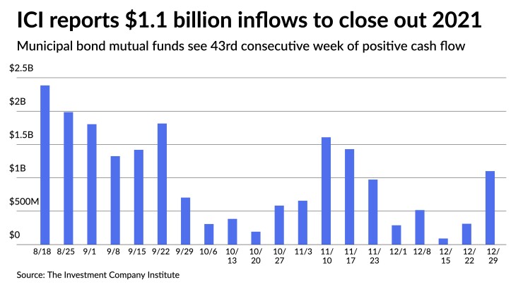 The Investment Company Institute reported $1.101 billion of inflows into municipal bond mutual funds in the week ending Dec. 29, up from $312 million in the previous week.
