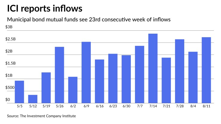 Long-term municipal bond funds and exchange-traded funds saw combined inflows of $2.724 billion in the week ended Aug. 11, the Investment Company Institute reported.