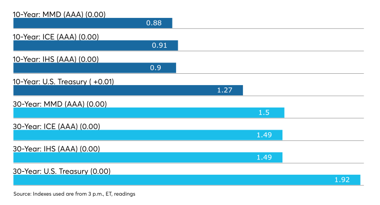 The IHS Markit municipal analytics curve showed short yields steady at 0.07% and 0.08% in 2022 and 2023, respectively. The 10-year yield was at 0.90% and the 30-year yield at 1.48%.