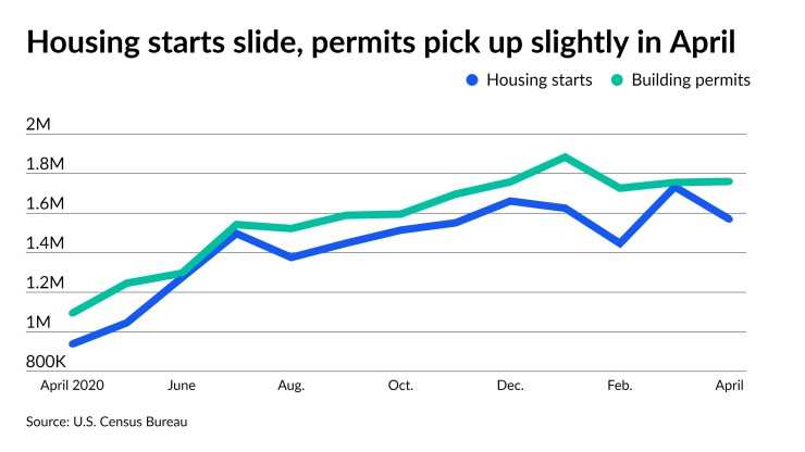 Housing starts fell 9.5% in April, following a revised 19.8% surge in March, while building permits ticked up 0.3% in April, following a revised 1.7% climb a month earlier.