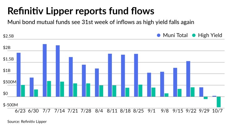 For 31 consecutive weeks, investors put cash into municipal bond mutual funds but saw just $36.87 million added in the latest reporting period while high-yield funds saw $460 million of outflows after $103 million of outflows a week prior.