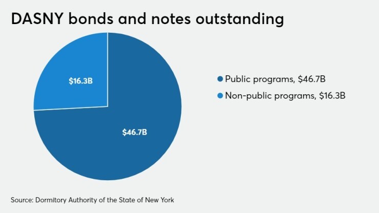 The authority is one of the largest issuers if municipal debt, with $63 billion of bonds and notes outstanding as of Dec. 31. That excludes Medical Care Facilities Financing Agency bonds and notes, which DASNY assumed in 1995.
