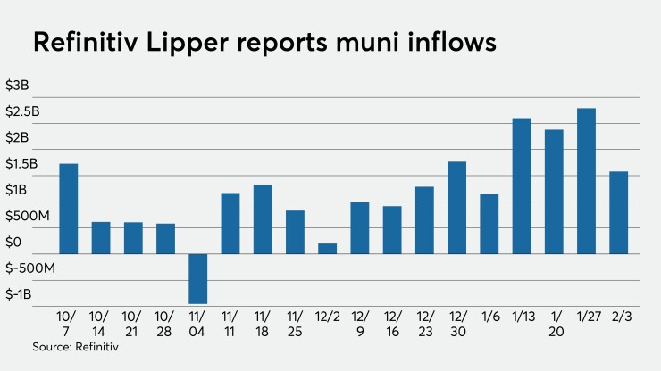 Continuing the large fund flows trend, Refinitiv Lipper reported $1.58 billion of inflows into municipal bond mutual funds for the week ending Feb. 3 after inflows of $2.79 billion the week prior, marking the 13th week in a row in positive territory. Long-term inflows were $1.2 billion and high-yield saw $610 million of inflows, while intermediates saw $87 million of outflows.