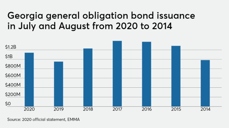 While Georgia in recent years has issued GOs for capital needs in July, Diana Pope, director of the Georgia State Financing and Investment Commission, said this year's sale was delayed a month because the General Assembly suspended its session in March to help contain the spread of COVID-19 and didn't finish work on the budget and bond authorizations until mid-June.