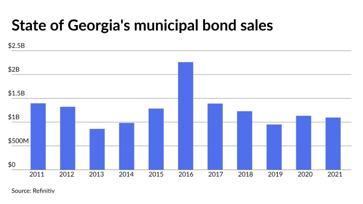 Since 2011, Georgia has sold almost $14 billion of bonds, with the most issuance occurring in 2016 when it sold $2.3 billion. It sold the least amount in 2013 when it issued $857.7 million.