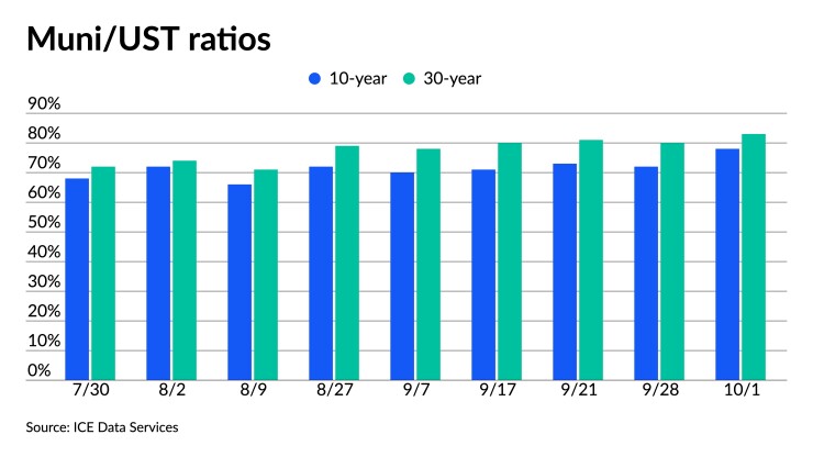 Ratios have moved into a higher, more favorable range, especially in the belly of the curve. The 10-year municipal-to-UST ratio is at 77% and the 30-year at 82%, according to Refinitiv MMD and ICE Data Services. The five-year ratio sits at 60% after hovering around 50% or less for months.