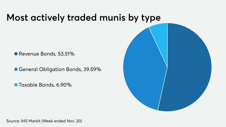The most active bond types traded this week were revenue bonds, followed by GOs and taxables, according to IHS Markit.
