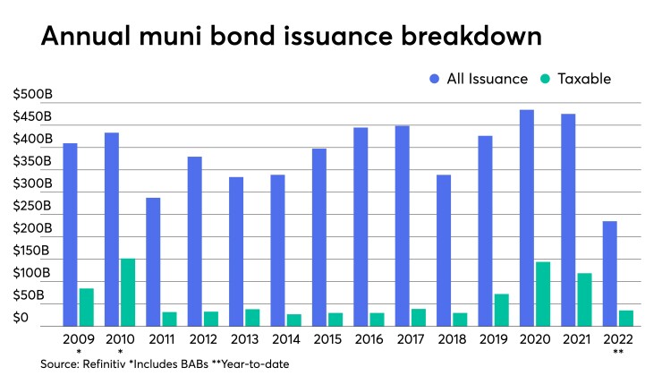Overall market volatility in 2022, though, has kept many issuers on the sidelines, and particularly stymied refunding and taxable volumes.