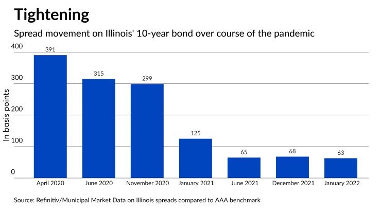 Refinitiv MMD at the time set the state’s one-year rate at a 345 basis point spread to the AAA benchmark, down from highs of 365 basis points to 400 basis points over the prior week.