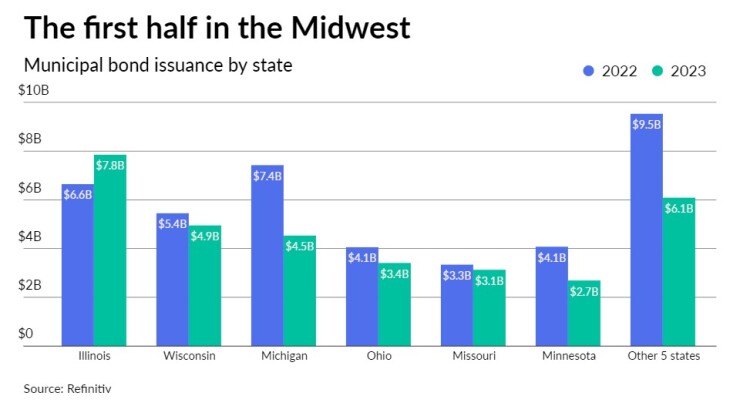 Wisconsin's issuers were the second most active in the Midwest, selling $4.95 billion of bonds, down 9.2% from the first half of 2022.