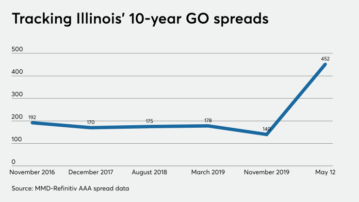 When the state last sold bonds in November, the 10-year landed at a 140 bp spread, although the coupons differed. The stark widening highlights the pandemic’s toll on investor sentiment with the state’s structural and pension ills and threats posed to its investment grade ratings now in the forefront.