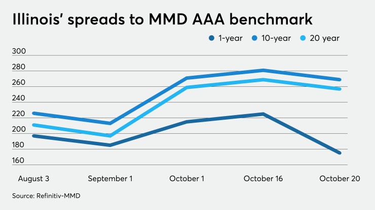 A 10-year bond paid a 3.64% yield with a 5% coupon, a 270 basis point spread to the AAA. The state’s 10-year had been set by MMD over the last week at a 281 basis point spread up from 271 basis points at the start of October. The 10-year yield of 3.64% represented a 144 basis point spread to the BBB where Illinois is rated.