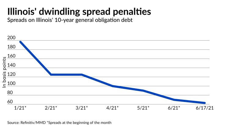 “A lot of the sectors and credits that were beaten up during the pandemic have seen spreads narrowing over the last month because of the economic reopening picture and vaccines etc. But no doubt, the move in Illinois spreads has been incredibly impressive over the past six months,” Saulnier said.