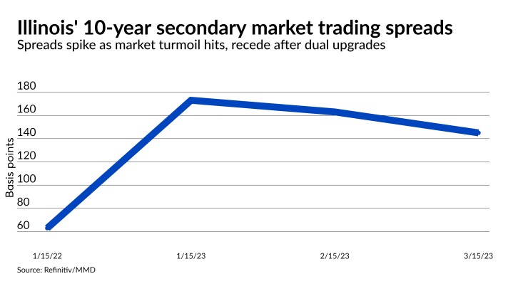 Trading spreads on Illinois GO bonds narrowed this week after the state's latest rating upgrade, and an uptick in tax revenues could help keep the positive ratings momentum going if the state makes more headway on paying off debts and building reserves.