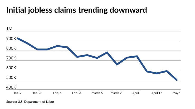 Initial jobless claims fell to a pandemic low of 498,000 on a seasonally adjusted annual basis in the week ended May 1 from an upwardly revised 590,000 a week earlier, first reported as 553,000.