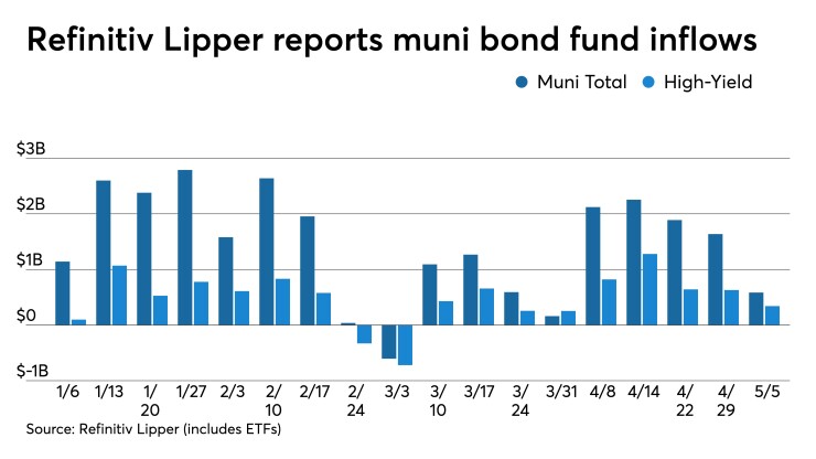Municipal bond mutual fund inflows ticked in at $584.911 million after an inflow of $1.637 billion in the previous week. Inflows fell below $1 billion for the first time since March.
