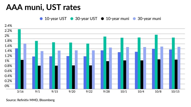Ratios fell on the day's moves, with the 10-year municipal-to-UST ratio at 74% and the 30-year at 82%, according to Refinitiv MMD. ICE Data Services had the 10-year at 73% and the 30 at 83%.