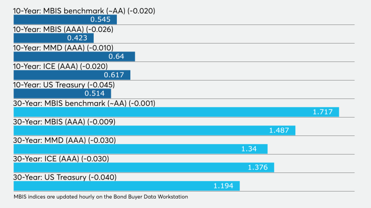 The IHS Markit municipal analytics AAA curve showed the 2021 maturity yielding 0.09% and the 2022 maturity at 0.12% while the 10-year muni was at 0.65% and the 30-year stood at 1.35%.