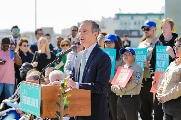 Garcetti signed the executive directive, “L.A.’s Green New Deal: Leading by Example,” on Monday.