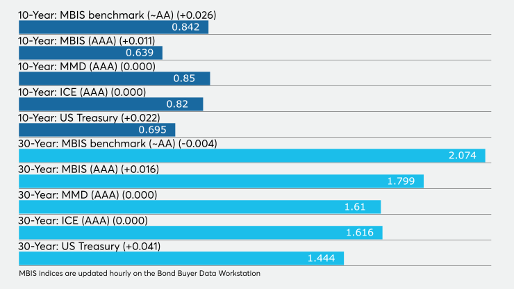 The IHS Markit municipal analytics AAA curve showed the 2021 maturity yielding 0.19%, the 2022 maturity at 0.24% and the 2023 maturity at 0.25% while the 10-year muni was at 0.84% and the 30-year stood at 1.61%.