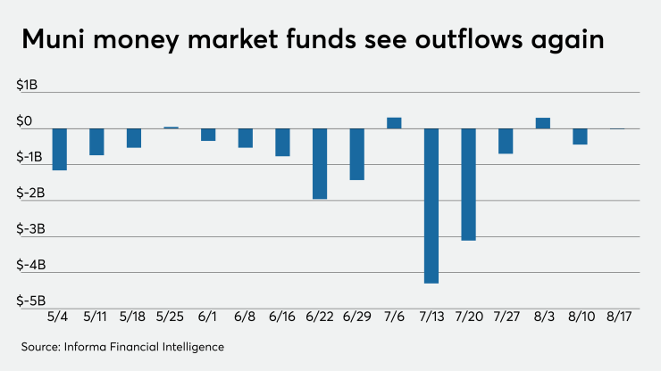 Tax-exempt municipal money market fund assets fell $14.8 million, bringing total net assets to $121.82 billion in the week ended Aug. 17, according to the Money Fund Report, a publication of Informa Financial Intelligence.