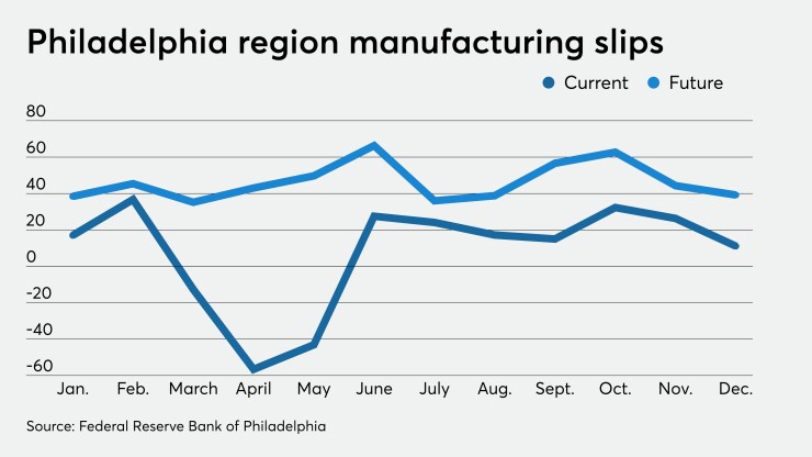 The manufacturing sector in the Philadelphia region showed “growth was less widespread” in December, according to the Federal Reserve Bank of Philadelphia's manufacturing Business Outlook Survey, released Thursday.